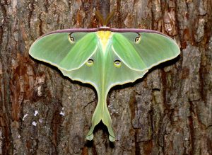 En los bosques de América del Norte, la polilla Luna (Actias luna) brilla con un tono verde pálido y una forma de alas que parece salida de un sueño. Sus largas colas traseras la ayudan a evadir murciélagos, confundiendo el eco de sus ataques.